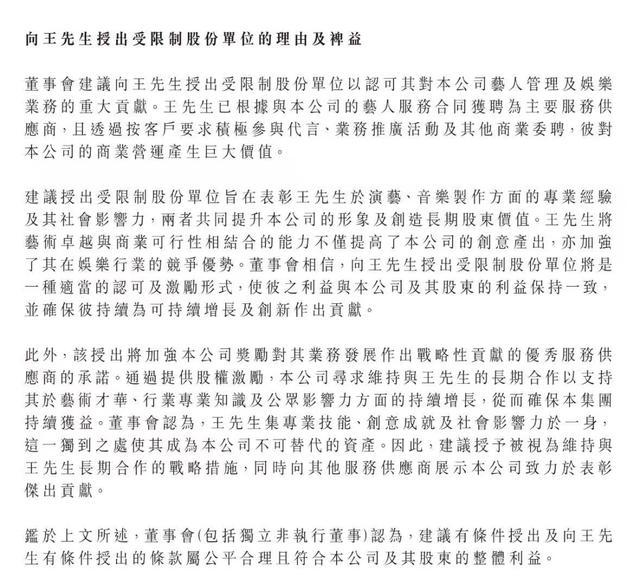 3月25日,港股上市公司乐华文娱公告,公司忽视有要求向王一博授出股份奖励,旨在认同及奖励其对集团业务作出的迥殊孝顺,寻求守护与王一博的始终配合。