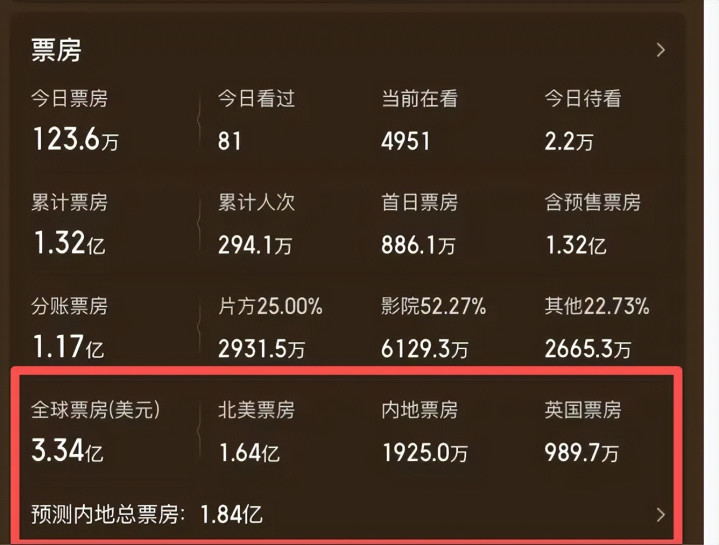 咫尺总票房杰出了1.32亿,全球总票房更是亮眼了,上映11天,狂轰下3.34亿好意思元(23亿东说念主民币)票房,