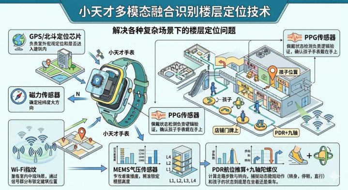 那不是只好气压传感器就行了?自然不是,气压计搞定了“楼层”问题,但在推行环境中,气压会受到天气、空调系统以致地下车库密闭环境的扰动,只靠感知气压来定位如故是7年前的中国科技了。往日的这些年,小天才楼层定位期间已历程四次大范围升级、更正。