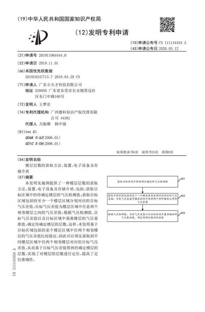 这份专利肯求(专利号:201911064444.0)由广东小天才科技有限公司肯求于2019年。小天才公司发明了一种楼层层数的取得圭表、安装、电子拓荒及储存的科技。