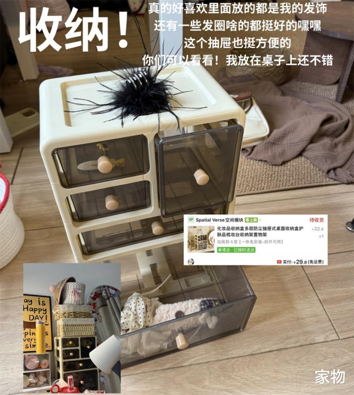 一个超大号的桌面收纳盒,非常合乎那种横向空间不及,需要诓骗纵向空间进行收纳的小桌子,其分红了多个收纳抽屉与收纳盒,能将多样种种的零碎杂物收入其中,看起来愈加整洁有序了。