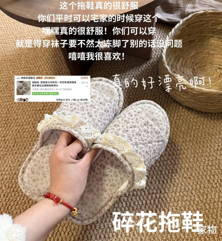 超颜面,超有郊外立场的一对碎花拖鞋,鞋底亦然那种带着厚厚棉垫的优柔脚感,最关键的是较为静音,无须惦念趿拉着会影响到楼下的邻居,唯独的缺憾就是略略有些薄,冬天的话有些冷,但当今这个季节刚好。