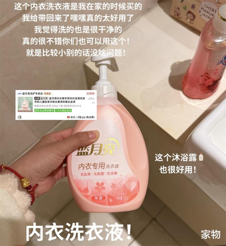 蓝月亮的内衣洗衣液亦然用了很久的了,滋味相称新鲜,清洁除菌后果也可以,我谨记它家随机还有个同款的沐浴露也都很好用,关键都是那种十几二十块的低廉货,性价比真的很高,合算!
