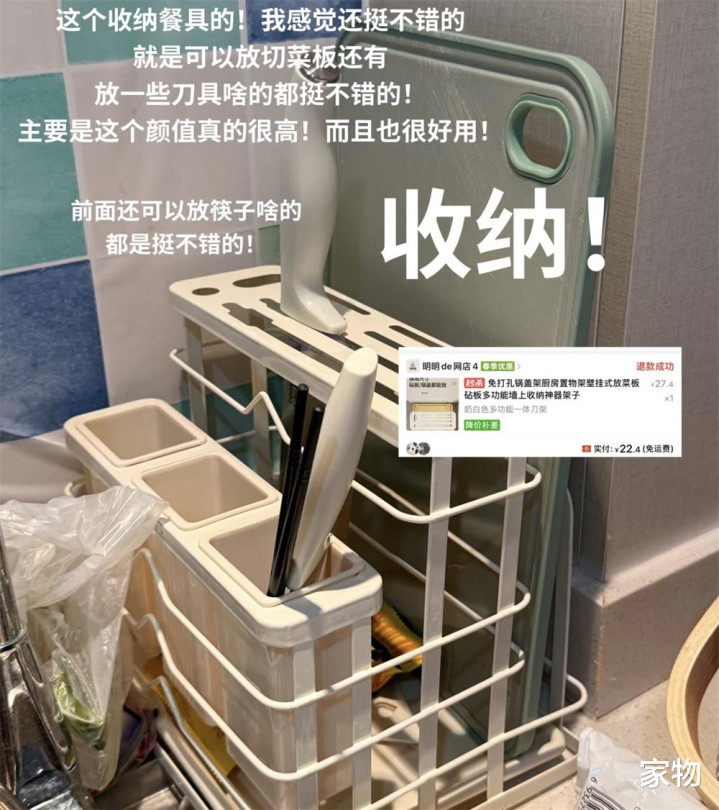 一样是厨房里一直在用的组合式厨具收纳架,分红了筷子篓、刀架、砧板架三部分,层层递进,将多样餐具厨具归类收纳在了一皆,颜值高的同期还便捷拿取,只需要时经常计帐一下底部的沥水盘就行。