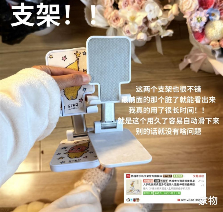 终末就是这手机支架啦,亦然几块钱的小玩意,但我没念念到除了轨则机还能放PAD,都是稳肃肃当,用个一两年认为有些松了,平直换新的就行(也可以垫个小纸片),归正使用资本不高。