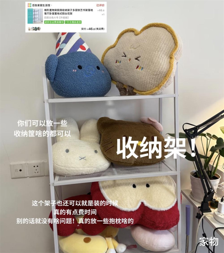 底部宽,上部窄的一个收纳架,蓝本应该是用在阳台受骗花架的,但当今发现放到房间里放一些摆件,或者是毛绒玩物之类的可儿小物也瑕瑜常合适,个东说念主嗅觉,唯有能放得下,这收纳架可以说是万用。