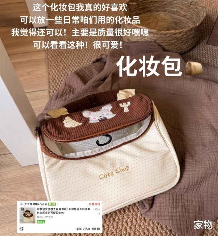 一个带提手的化妆包,内部有挂钩和各层,能奥妙分类收纳多样清洁化妆用品,关键是质料也相称可以,很难敬佩它才十几块钱,比我之前买的许多大牌化妆包都好用,由衷给诸位保举一下下。