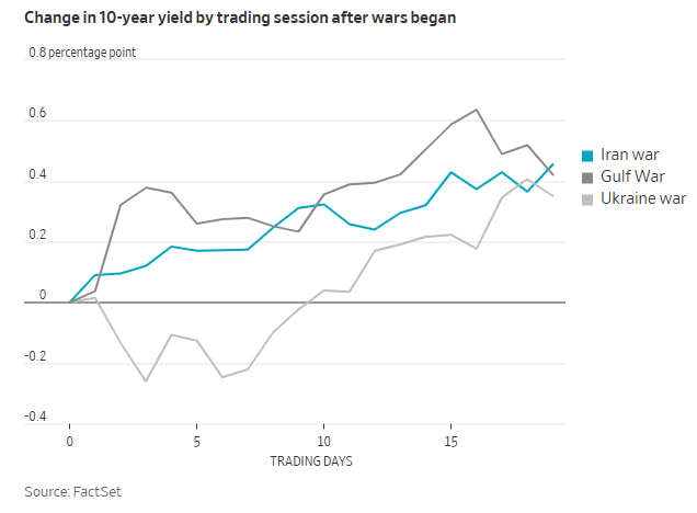 如下图所示,10年期好意思债收益率在本轮好意思伊干戈爆发以来的涨幅,基本与俄乌打破和海湾干戈同阶段时格外。