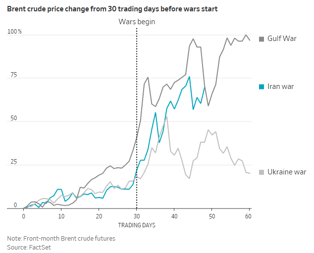 自年头以来,黄金城官网大家基准的布伦特原油期货价钱已飙升约80%,即便此前考虑好意思伊进行谈判的报说念曾一度激发大幅抛售。如下图所示,自上月底战事爆发无东说念主机和导弹初始平凡飞越霍尔木兹海峡以来,油价收尾刻下的飙升幅度与1990年海湾干戈爆发后的时候最为同样。