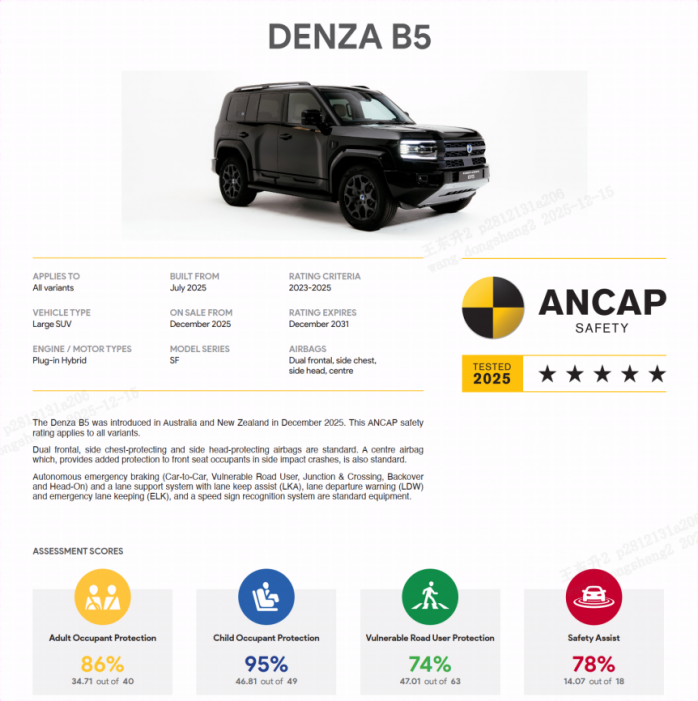 据悉,该测试后果是人人杰出的汽车安全评估机构——澳洲新车安全评鉴协会(ANCAP)证明公布的车型安全评级,方程豹豹5凭借超卓的主动和被迫安全性能,荣获五星安全评级。在成东说念主保护、儿童保护、行东说念主保护、安全扶助等四大中枢板块测试名堂均达到人人杰出水平,其中儿童保护得分率为95%,是ANCAP积年测试后果中名次最高的车型之一,国产硬派越野再获认同。