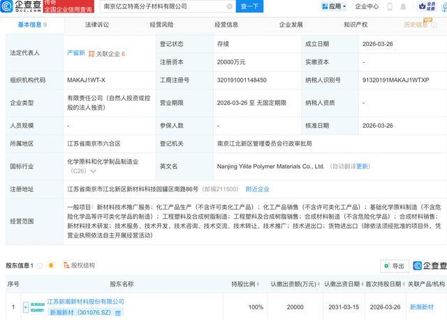 企查查APP清晰,近日,南京亿立特高分子材料有限公司设立,雅博体育app注册老本2亿元,盘算范畴包含:工程塑料及合成树脂销售;合成材料制造(不含危机化学品);合成材料销售;新材料时刻研发等。企查查股权穿透清晰,该公司由新瀚新材(301076.SZ)全资握股。