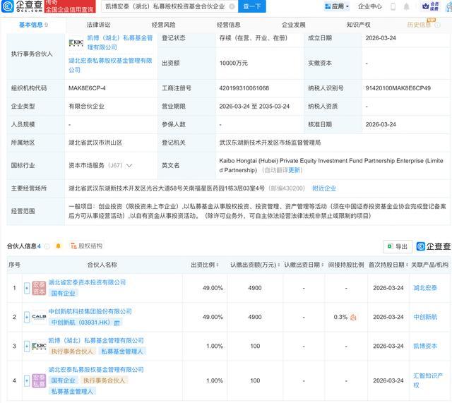 企查查APP剖判,近日,凯博宏泰(湖北)私募股权投资基金合股企业(有限合股)开垦,雅博app官网入口出资额1亿元,谈论领域包含:创业投资(限投资未上市企业),以私募基金从事股权投资、投资解决、钞票解决等手脚。企查查股权穿透剖判,该企业由中翻新航(03931.HK)等共同出资。